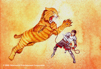 Now, that's the last straw! If you're going to claw, I'll be forced to teach you your place! Well, what's it to be? Don't you dare hiss at me! Your behavior's become a disgrace! For a moment the Grumpuss Seemed dazed and confused, And the knight felt the leash go slack, So he quickly tried to get untied, But the cat launched another attack. At last, in an equal fury, Sir Ellery drew his broad sword, And railed against the Grumpuss That spit, and clawed and roared. |
