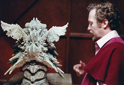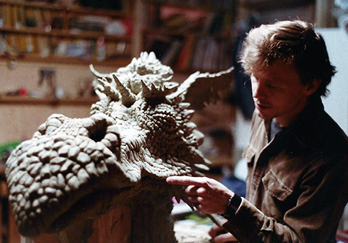 WILLIAM (BILLY) BRYAN BRINGS LONG-GRIN INTO THE WORLD In 1984, the Long-Grin Saga was already an expensive undertaking, even for a major studio. Nevertheless, as director of production for Cine-Media International, and with verbal support of its president and CEO Bond Johnson, Travis hired Billy (who about the same time created and Played Mr. StayPuft for GHOSTBUSTERS), to make a model of Long-Grin's head that Travis could show to studio executives and/or investors that they could see, touch, and have their pictures taken, it might go a long way to convincing them that LONG-GRIN was as feasible as it was exciting. Travis and Billy had several meetings to discuss all the elements required in the design of the dragon's head, including the critical elements required for the dragon to "speak," and with the aid of puppeteers, display facial expressions that would be properly interpreted by an audience. BIlly began work on what became a 17-part mould. The model was not intended to be operational, but designed to allow for the servos and wiring required when the show went into production. What you see on this page is what Travis saw on the first day he went to see Long-Grin in Billy's studio. |