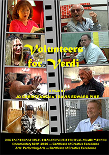 At the northernmost border of Los Angeles' Chinatown, Casa Italiana is home to as eclectic a crowd as ever appeared in a Hollywood movie. Drawn together by unflagging passion, dreadful tenacity, and the notion that opera goes down better with a plate of spaghetti, these VOLUNTEERS FOR VERDI embody the rich cultural mix in Southern California, where America's melting pot continues to bubble and individual dreams may and do come true, even into the twilight years. This independent production won two Certificates for Creative Excellence at the 2006 US International Film and Video Awards, one in the category Arts: Performing Arts, and the other in the category Documentary: 60:09 - 90:00. |