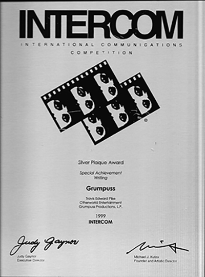 Travis Edward Pike's GRUMPUSS World Premiere Benefit Performance, won a Silver Plaque for Special Achievement Writing in the 1999 International Communications Film & Video Competition in Chicago, Illinois. It was the only award presented in this category that year and the previous year, no writing award was presented. To the best of our knowledge, this marks the first time in the 35-year history of the Chicago Film Festival, perhaps in the entire history of motion pictures and video productions, that an epic narrative rhyme was so honored. |