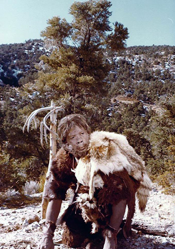 "You're just sitting around your campfire, one big, happy family. But do keep your hands close to your bodies. The glue that holds the hairy patches on your hands is flammable and we wouldn't want any mishaps . . ."