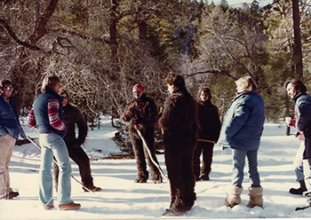 In the monkeys' next sequence, they are to be attacked by timber wolves. The Mountain Man, in full makeup, wants to be sure his part has not been enlarged to include him in the timber wolf sequence. He is NOT a stunt man!