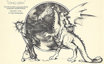 (1st column descending)--Nial misses his chance to slay Long-Grin. Sigismund and Hildegard become engaged. (2nd column descending)--Merlin has to deal with the sorcerer...and the dragon. Gwen embraces her hero, Nial. (third column descending)--Merlin warns the court of impending disaster. Akimera, kidnaps Princess Gwen. Nial runs afoul of the sorcerer. Looking at these sketches, the idea of Long-Grin as an illustrated novel, doesn't seem at all far-fetched. |