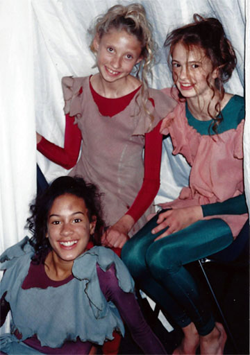 THE WINSOME WAIFS My Waifs-in-Waiting were costumed by Alice Hughes, had their makeup and hair done by Joanne Frye and were eagerly waiting for the call. Abandoned and forlorn, they managed to smile for our London still photographers Dennis and Steve Ramsey. From left to right (and down to up), the young ladies are Aimee Johnson, Yvonne Hill, and Rosy Meredith. No 'opening night jitters, here.' They'd been well-rehearsed in their lines, their actions, reactions, "business," unspoken lines and background stories at Saint Margaret's church in Coventry and were already 'in character.' Coach Marion Sands saw that they were thoroughly rehearsed on their gymnastic routines, but their first rehearsal in the theater was on the day before the premiere, and they discovered that despite the height and width of the marquee, they had to compress their performance area to allow for lighting and camera angles. |