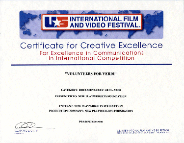 3 JUNE 2006: Chairman Lee Gluckman of the U.S. INTERNATIONAL FILM & VIDEO FESTIVAL (left), presents Certificates of Creative Excellence to Producers Jo Christensen (center), and Travis Edward Pike (right), for their New Playwrights Foundation Production, VOLUNTEERS FOR VERDI. Those are not duplicate awards. The film won certificates in two separate competition categories - "Arts: Performing Arts," and "Documentary: 60:01- 90:00." |